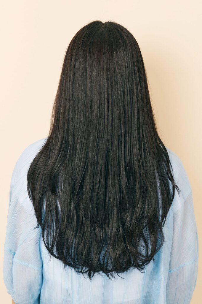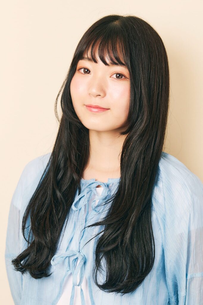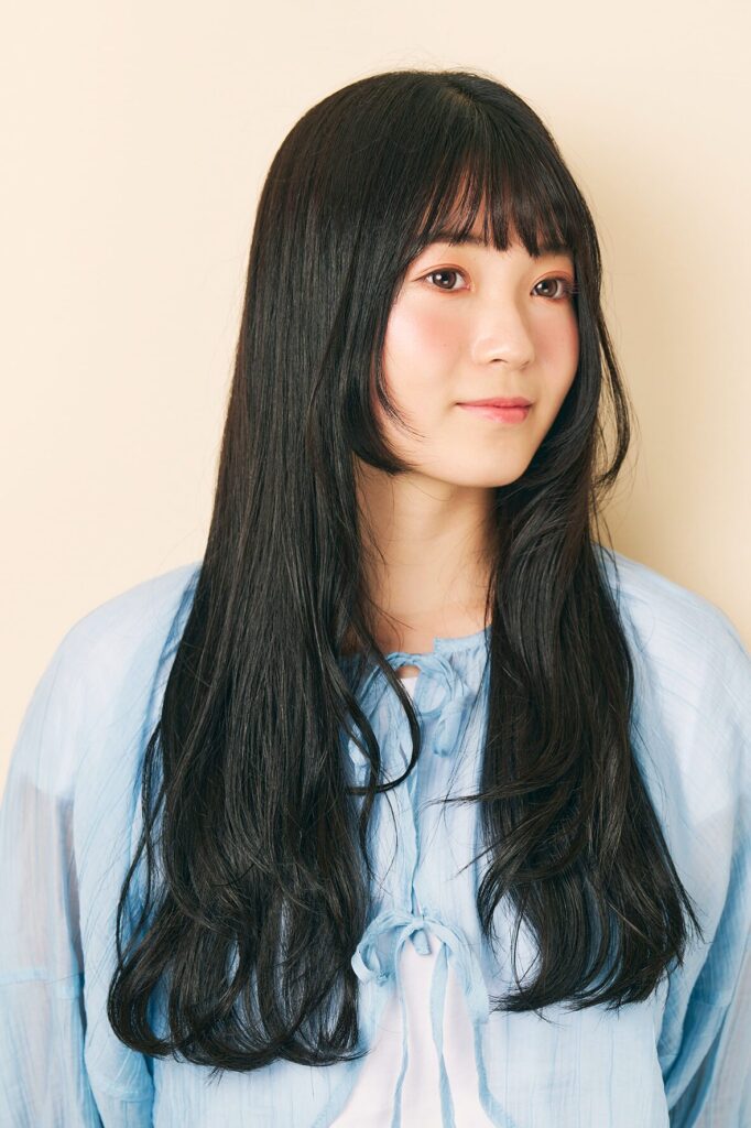 しっかりと厚みのある黒髪ロングは、毛先にかけてややレイヤーを入れることで、動きと軽やかさをプラス。全体は自然なストレート感を保ちつつも、顔まわりにほんのり内巻きを加えることで、優しげな印象に。前髪は薄めのシースルーバングで抜け感を演出し、目元の印象を引き立てながら、表情に柔らかさをもたらしています。スタイリングはナチュラルなツヤを意識し、重く見せない仕上がりに。