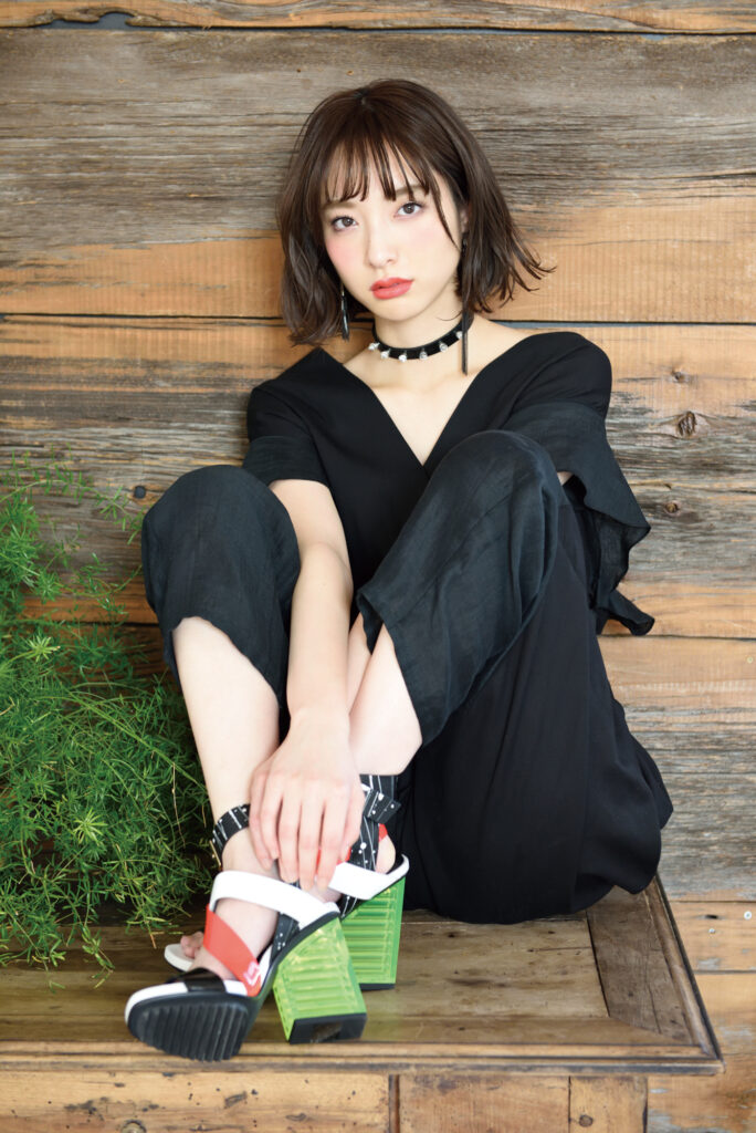 まっすぐな視線と少し力の抜けたポージングが、都会的でエフォートレスなムードを醸し出すスタイル。ウッドの背景に映えるオールブラックコーデに、リップの赤みやヘアの軽やかさが程よい女性らしさを加えています。強さと柔らかさが同居する、今の気分にぴったりのバランスです。