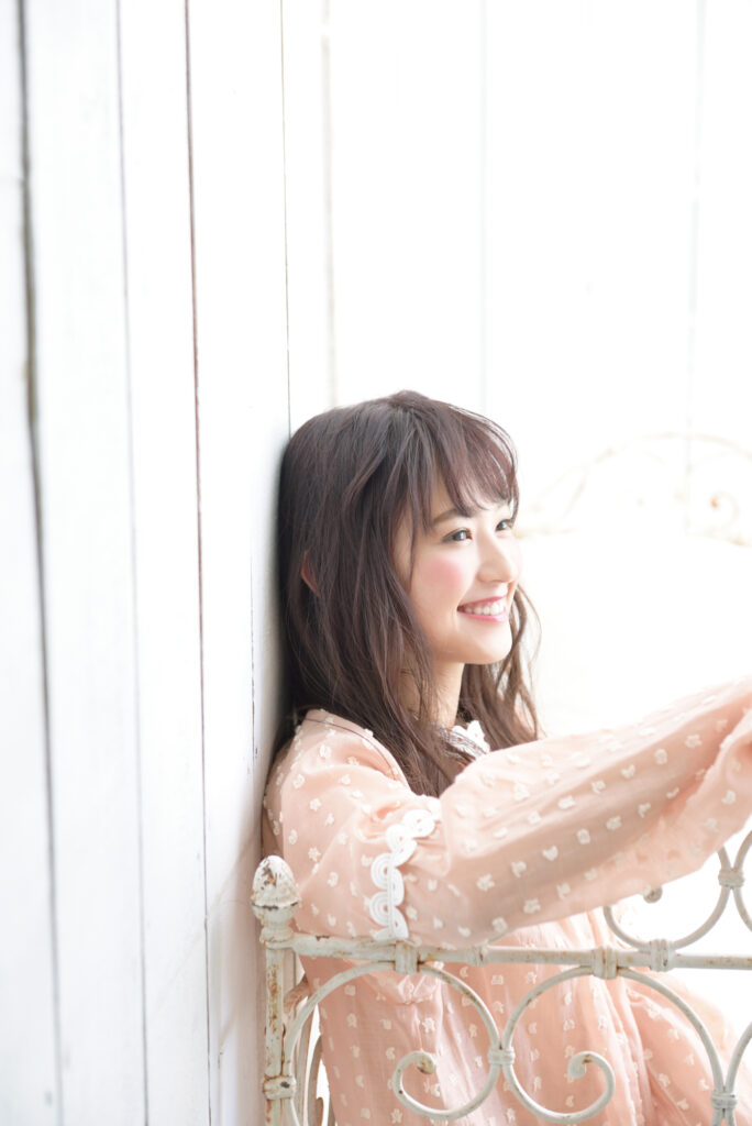 柔らかな光に包まれた立花玲奈さんが纏うのは、可憐さと透明感を両立させたヘアメイク。自然体でありながら計算されたニュアンスが、彼女の持つピュアな魅力を最大限に引き出しています。