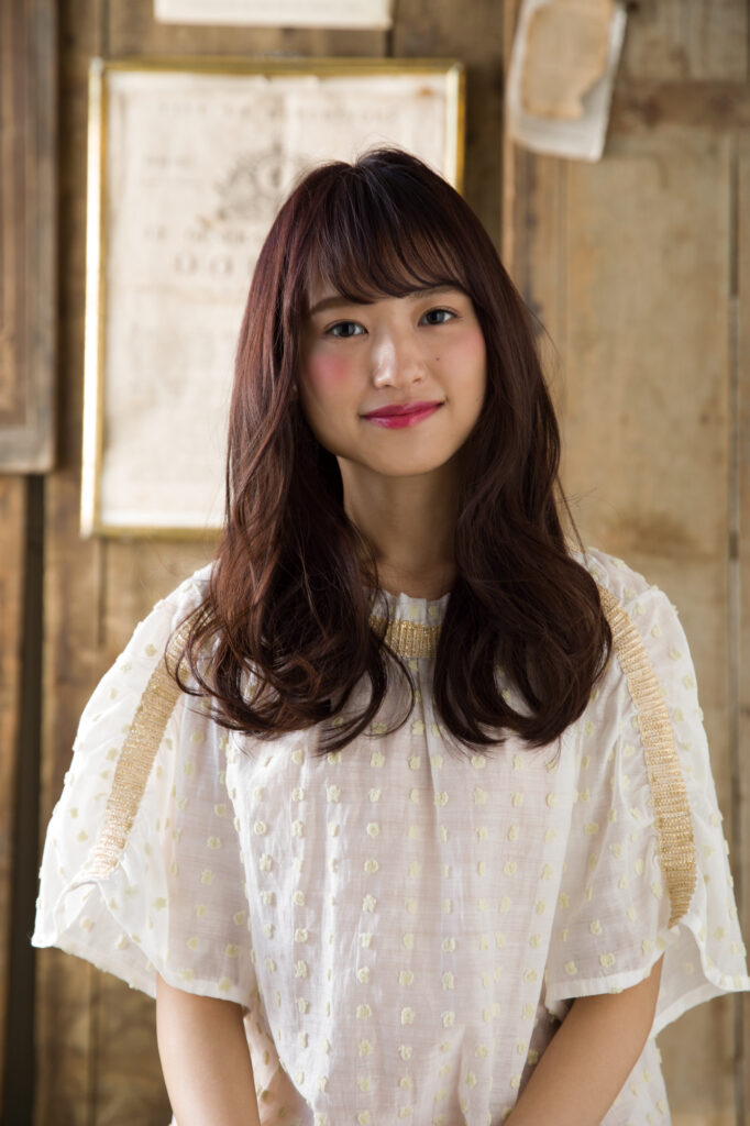 鎖骨下にかけて緩やかに落ちるカールが、立体感と華やかさを演出。根元から中間はストレートに近く、毛先にかけて自然な動きをつけることで、重さと軽さのバランスが絶妙に。前髪は透け感を意識したシースルーバングで、可憐な印象を引き立てています。