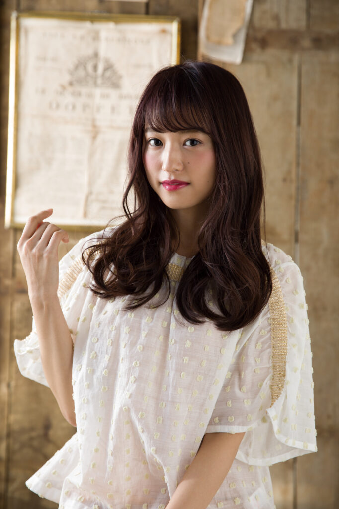 動きのあるカールヘアと、血色感をたっぷり仕込んだメイクの相乗効果で、愛らしさの中に大人の気品をプラス。ヘアのボリューム感が華やかなオーラを演出し、柔らかくも印象的な存在感を放っています。
