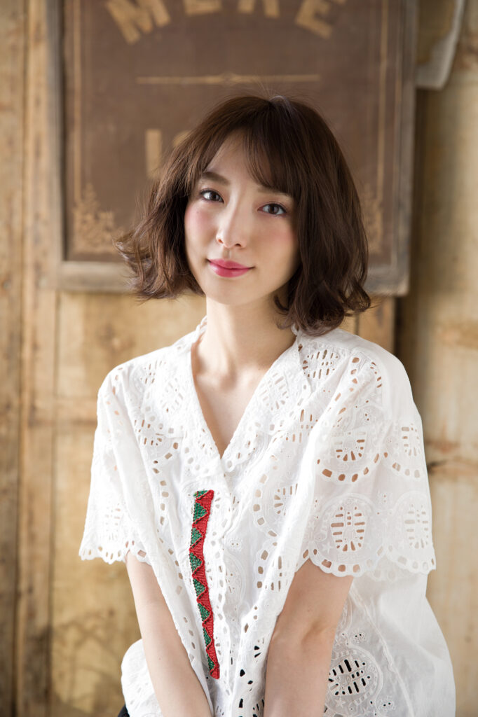 あどけなさを残したような透明感と、大人の女性らしい落ち着きが同居するスタイル。短めのレングスにふんわりとしたカールを施すことで、軽やかさと華やかさが共存。白のカットワークブラウスと相まって、ナチュラルでありながらも視線を惹きつける印象を作り出しています。