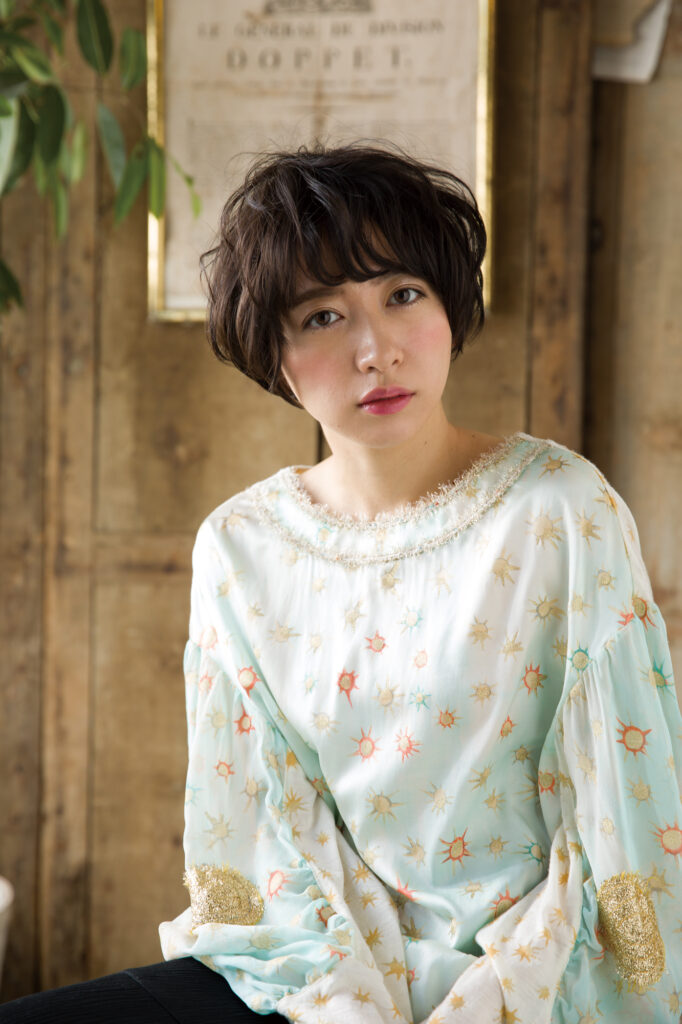 短めのレングスに無造作なカールを効かせることで、軽やかな動きを演出。どこかアンニュイな雰囲気を残しつつも、清楚さと可愛らしさが同居する印象に。ナチュラルな光を受けて、髪と肌の透明感がより一層引き立っています。