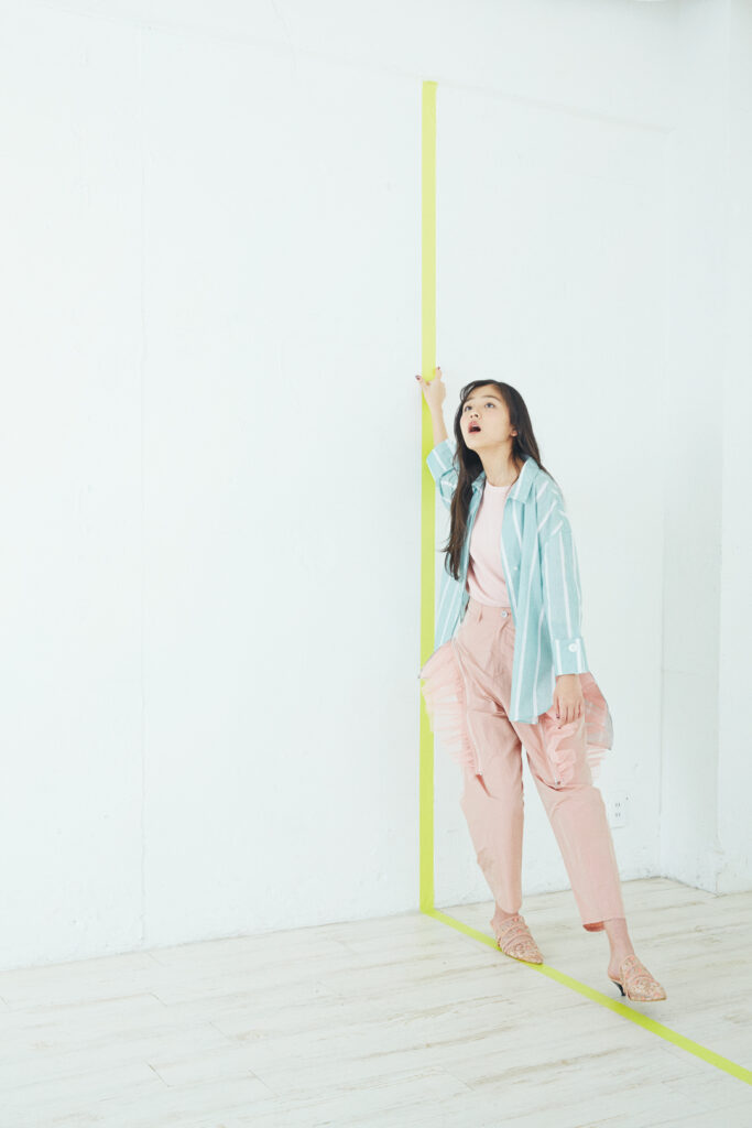 白い空間とイエローのラインテープというシンプルな舞台に、モデルの柔らかいピンクとブルーのスタイリングが映えるビジュアル。どこかオブジェのように配置された動きから、静と動が混ざり合う不思議なムードが漂う。