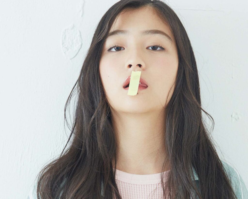 そして写真の中で印象的なのは、口元に貼られた小さなイエローテープ。メイクアップという枠を軽やかに超える“アートとしてのアクセント”が、ihmeの世界観とCOVER HAIRのクリエイティブ性を象徴している。