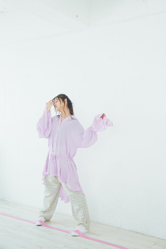 真っ白な空間に、ラベンダーのトップスがふわりと浮かぶように存在する。