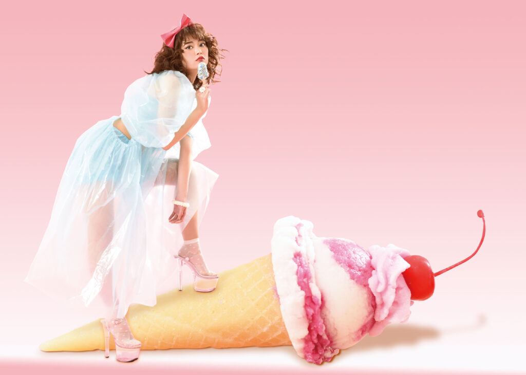 巨大なアイスクリーム、パウダリーなピンクの世界、そして無垢と意志を併せ持つ眼差し。
