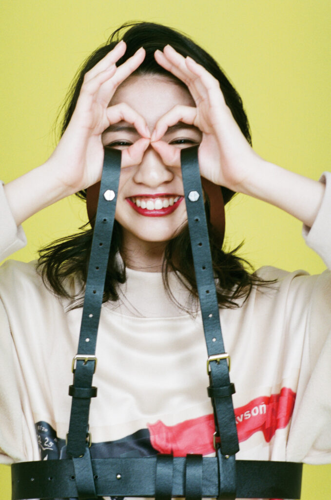 代表の谷本一典がヘアメイクディレクションを手がけ、青島妃菜の持つチャーミングな表情と、ファッションのエッジを知的に融合させた。