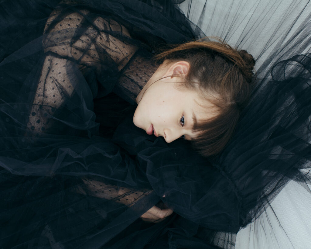 チュールの黒に包まれ、身体を預けるようなポージング。その佇まいは、見る者に物語を委ねる余白を残す。今回のヘアメイクは「強く見せる」ためではなく、「感じさせる」ための設計。谷本一典率いるカバーヘアクリエイティブが導いたのは、感情がふと漏れ出る瞬間のリアリティだ。モードでありながら、どこか人肌の温度を感じさせる印象に仕上がっている。
