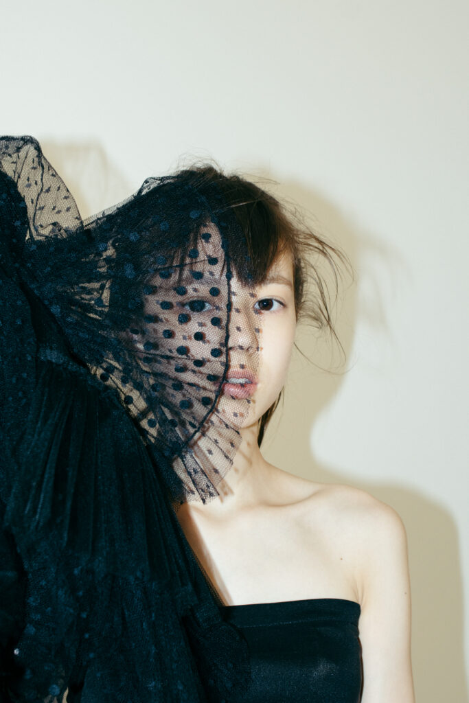 ヘアはタイトにまとめすぎず、顔周りにあえてニュアンスを残したスタイル。チュールの質感と干渉することで、柔らかな動きが生まれている。無造作に見えて、実は毛流れとシルエットは緻密に設計。谷本のディレクションが光るのは、強い衣装に対してヘアを“主張させすぎない”バランス感覚だ。結果として、全体に奥行きが生まれている。