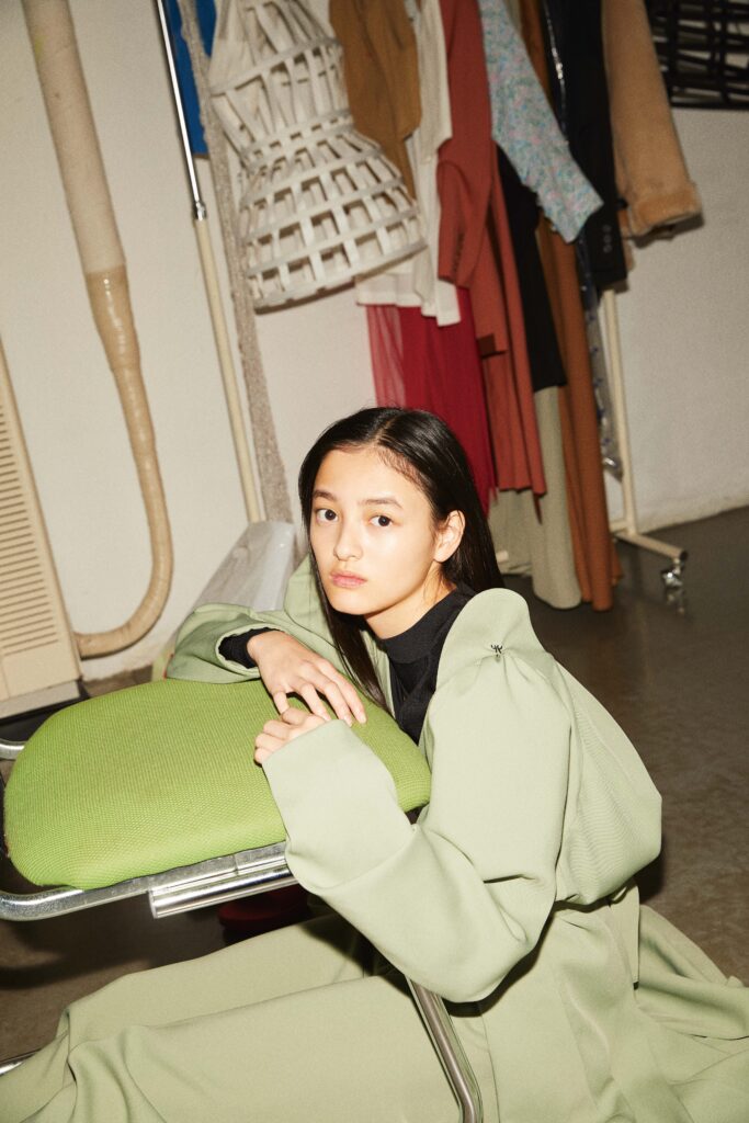 柔らかなピスタチオグリーンのセットアップに、黒のインナー。クリーンで知的な配色の中に、どこか私的なムードを感じさせるワンシーン。