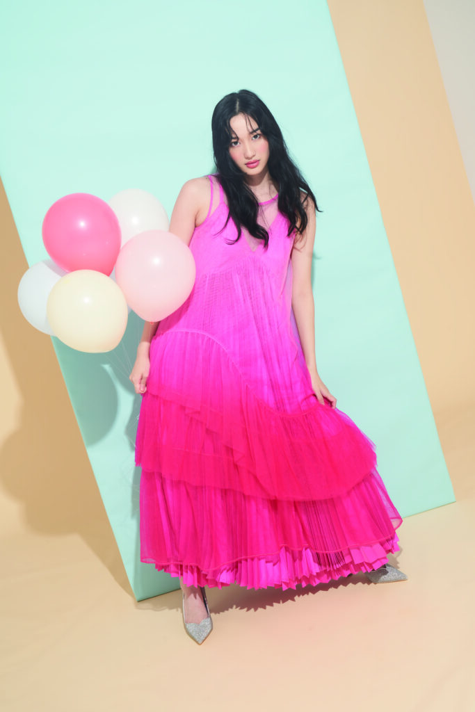 柔らかなピンクのドレスに包まれた佇まいは一見ロマンティック。しかし、その視線にはどこか凛とした強さが宿り、単なる甘さに留まらないモードな空気を漂わせている。背景のペールトーンやバルーンの軽やかさとリンクしながらも、全体はあくまで“洗練された大人のフェミニン”。カバーヘアクリエイティブが得意とする「抜け感」と「計算されたナチュラル」が見事に融合し、見る者に余韻を残すビジュアルに昇華されている。